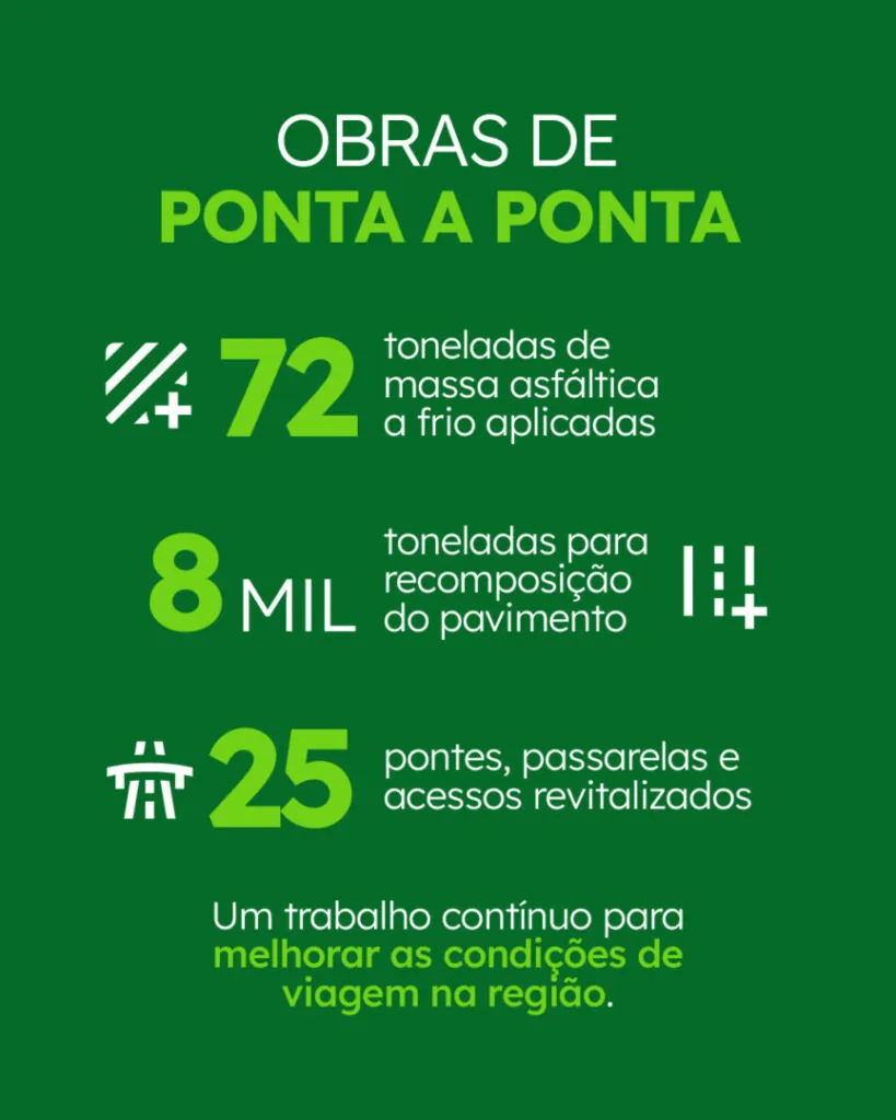 Nesse primeiro ano de atuação, a concessionária realizou um plano de recuperação emergencial de todo o pavimento no trecho administrado. Para isso, foram usadas mais de 72 toneladas de massa asfáltica a frio para operação tapa buraco, além de 8 mil toneladas de masssa asfáltica para fresagem e recomposição. No período, 25 pontes, passarelas e passagens inferiores também foram revitalizadas.