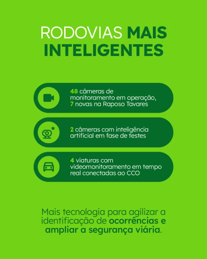 O monitoramento das rodovias evoluiu consideravelmente: a Raposo Tavares ganhou sete novas câmeras fixas, elevando para 48 o total de equipamentos em operação, além de duas câmeras com inteligência artificial capazes de identificar uso de celular ao volante e falta de cinto de segurança dos passageiros. Além disso, quatro viaturas passaram a operar com câmeras laterais, frontais e traseiras conectadas ao Centro de Controle Operacional (CCO).