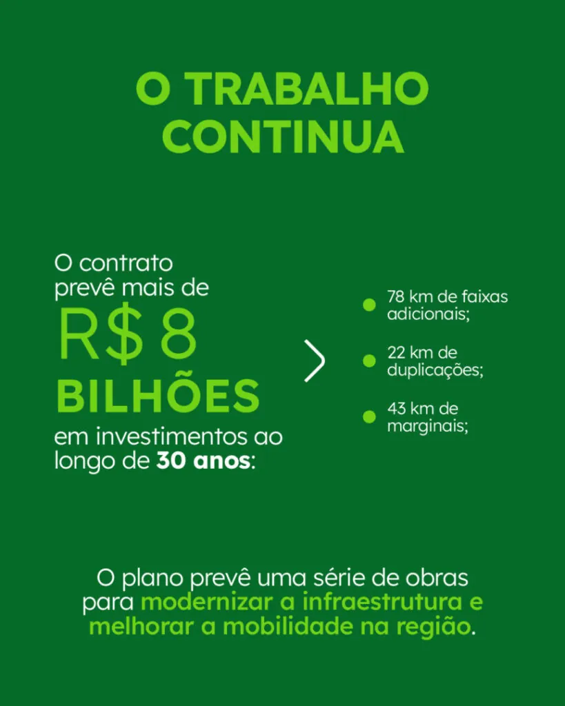 O contrato de concessão prevê investimento de mais de R$ 8 bilhões ao longo de 30 anos. Entre as futuras entregas estão 78 km de faixas adicionais, 22 km de duplicações, 43 km de marginais, duas áreas de descanso para caminhoneiros, 32 novas passarelas e a construção ou adequação de dezenas de acessos, retornos e trevos.
