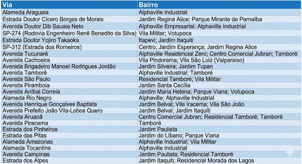 As equipes atuarão em diferentes regiões de Barueri, incluindo áreas como Alphaville, Tamboré, Jardim Belval e Jardim Silveira. Entre as principais vias contempladas estão: Alameda Araguaia; Estrada Doutor Cícero Borges de Morais; Avenida Doutor Dib Sauaia Neto; Estrada Doutor Yojiro Takaoka; Estrada dos Romeiros; Avenida Tucunaré; Avenida Cachoeira; Avenida Tamboré; Alameda Rio Negro; Avenida Aníbal Correia; Avenida Henrique Gonçalves Baptista; Avenida Prefeito João Villa-Lobos Quero; Avenida Piracema; Estrada das Pitas e Alameda Tocantins (confira todas as vias na tabela abaixo).