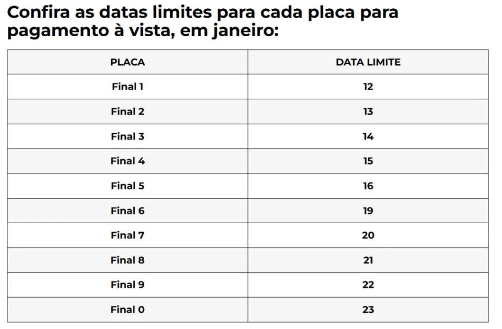 Motoristas que optarem pelo licenciamento antecipado poderão pagar o saldo do IPVA até 23 de janeiro, com desconto, até 23 de fevereiro, sem abatimento, ou até a data de vencimento da parcela, caso tenham escolhido o pagamento parcelado.